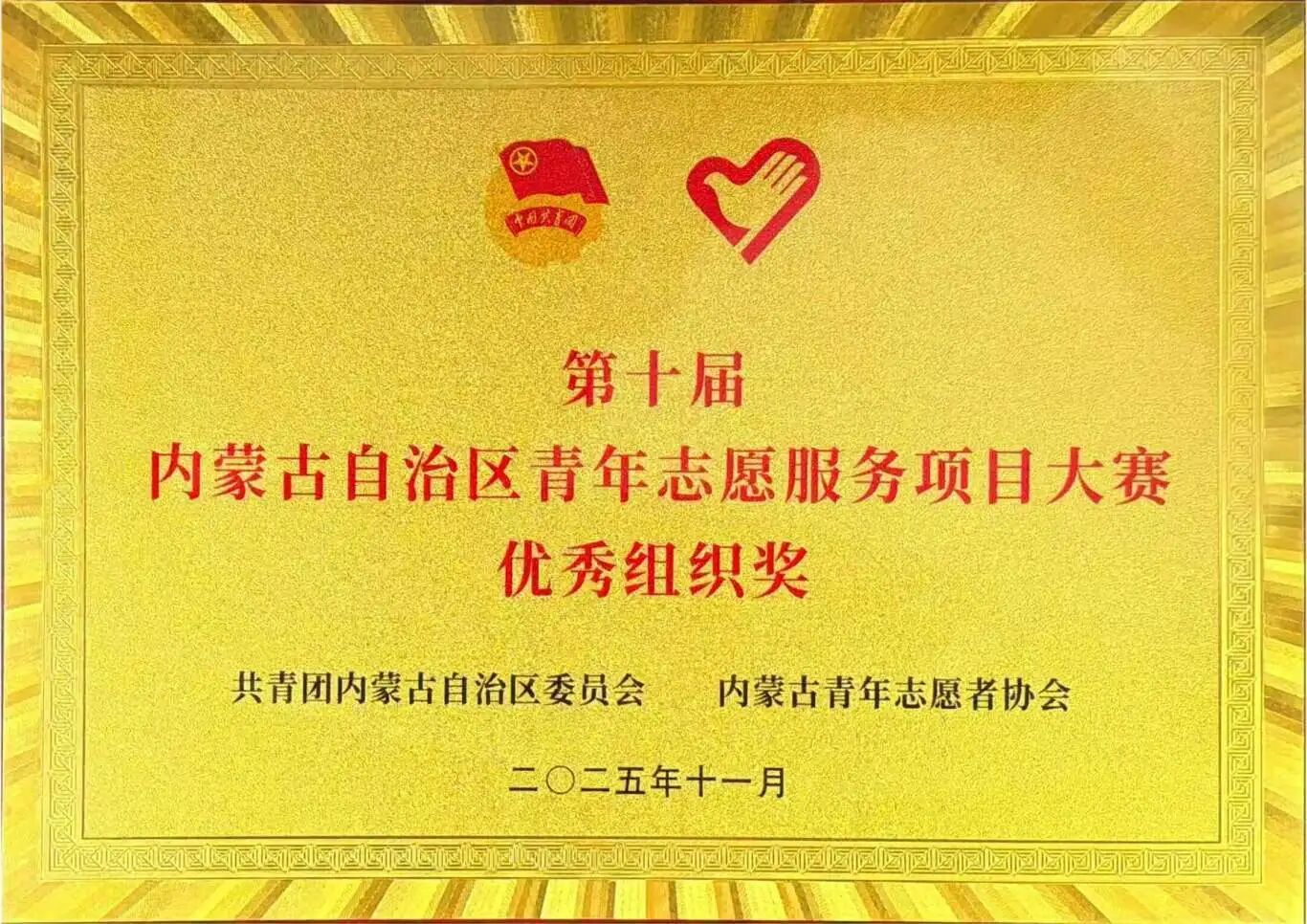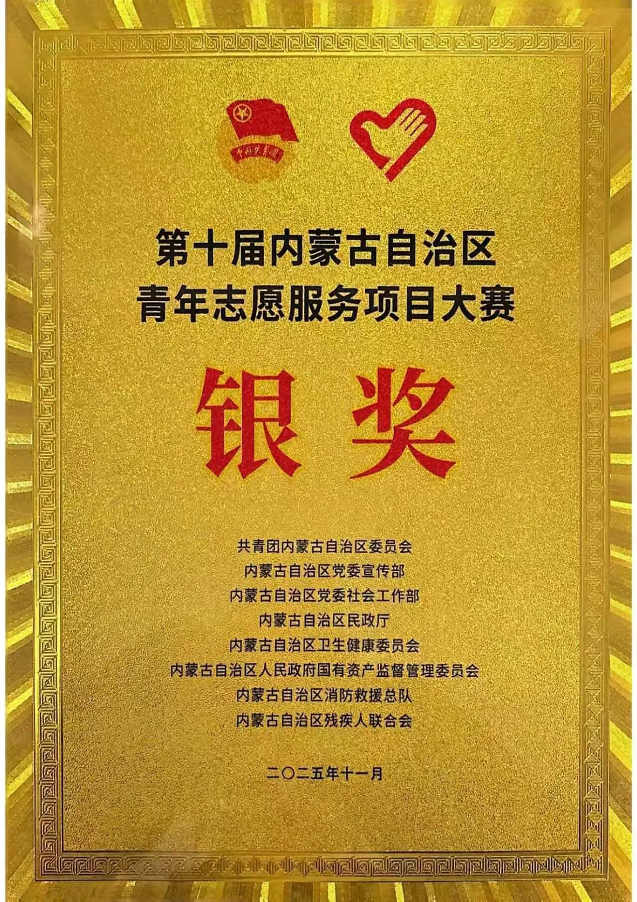 2025年11月25日至27日,“十载耕耘绽芳华 志愿服务耀北疆”全区第十届青年志愿服务项目大赛在呼和浩特市成功举办。本次大赛由自治区团委、党委宣传部、党委社会工作部、民政厅、卫生健康委员会、国有资产监督管理委员会、消防救援总队,残疾人联合会等单位共同主办。经过激烈角逐,我校“食安守护·爱心童行”大学生志愿科普行动项目脱颖而出,荣获大赛银奖,学校获评优秀组织单位。